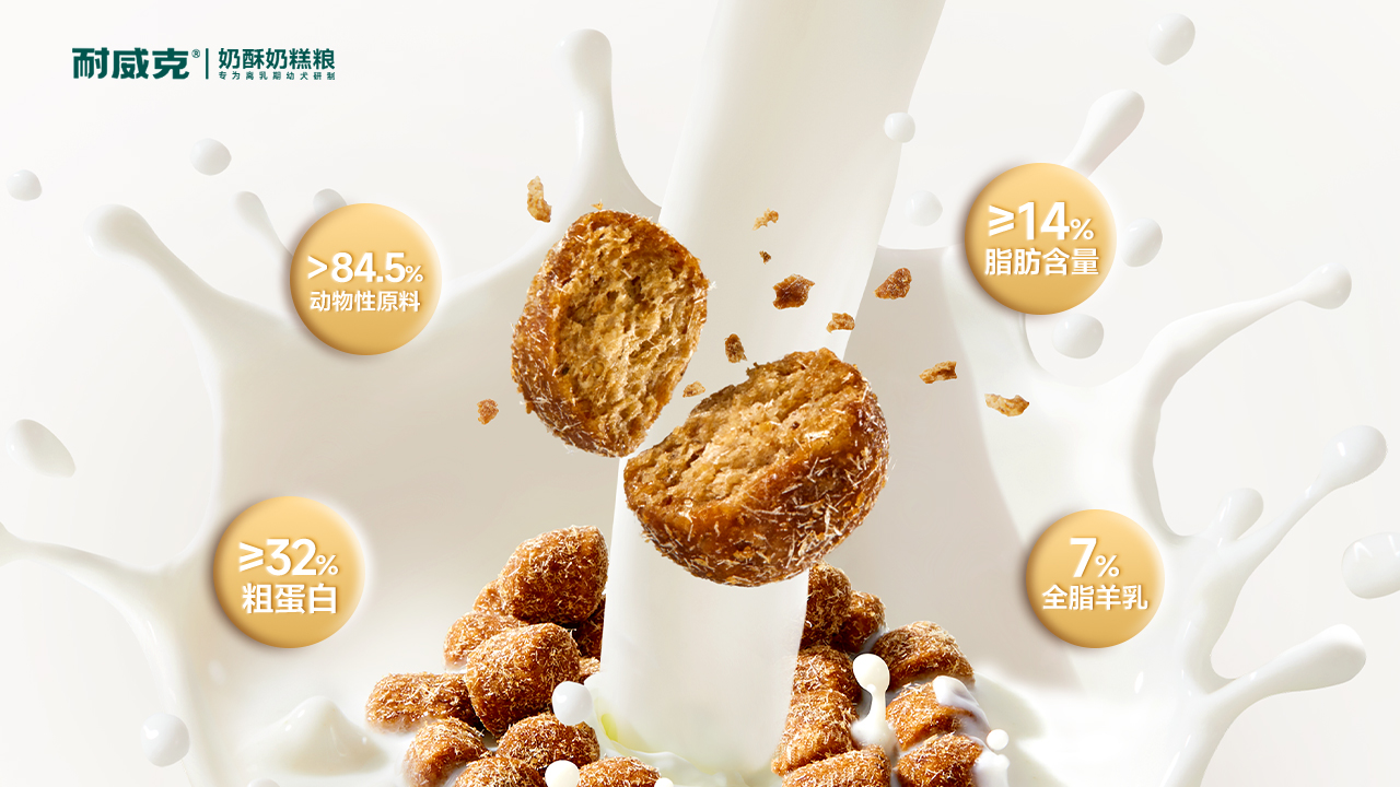 耐威克首次明确提出“羊乳是酥化工艺的最佳搭配”的科学主张。羊乳中的脂肪球颗粒显著小于牛奶,更易于通过微孔结构被吸附和渗透,从而实现营养的“长驱直入”。同时,羊乳富含天然A2型β-酪蛋白,致敏性极低,可有效降低幼犬腹泻和过敏风险,真正实现“母乳级”喂养。