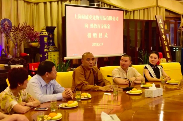 2018年5月17日下午,上海耐威克宠物用品有限公司与佛教百寺基金举行捐赠仪式,上海耐威克宠物用品有限公司向佛教百寺基金捐赠宠物食品一吨。捐赠仪式上,在慧明会长提议,爱心善信支持下,出资一百万元在佛教百寺基金下设立“爱护动物专项基金”。